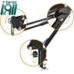 این پایه میکروفون از جنس تماما فلزی ساخته شده و از دو بازوی مستقل بهره میبرد. وجود فنرهای مقاوم در قسمتهای بالایی و پایینی باعث میشود لرزشهای ناشی از میز به میکروفون منتقل نشود و کیفیت صدای شما بدون نویز باقی بماند. همچنین این محصول از بست فلزی محکم برای نصب روی لبه میز با ضخامت 1 تا 5 سانتیمتر بهره میبرد که به کمک یک اهرم چرخشی، بهسادگی و بدون دردسر نصب میشود.