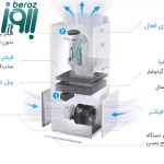 - فیلتر الکترواستاتیک HEPA با عمر ۱۰ سال: این فیلتر قادر است ذرات معلق ریز تا اندازه ۰.۳ میکرون را با دقت ۹۹.۹۷٪ جذب کند و برای افراد مبتلا به آلرژی، آسم و بیماریهای تنفسی بسیار مؤثر است.